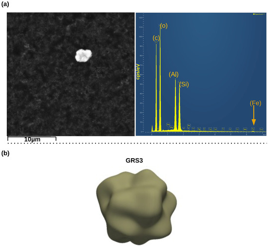 (a) Single aerosol-particle sample shapes (kaolinite) and their spectra, obtained via the scanning electron microscope (SEM) of Saharan mineral dust sample with a small percentage of iron impurity, and (b) is the particle shape model used (GRS3) to mimic the shape in the SEM image. The particle is then dopped with 98% kaolinite and 2% hematite at different mixing states. The complex refractive index of kaolinite is taken as , while that of Hematite is . The scattering results are listed in Table 1 for comparison purposes.