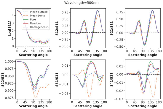 Simulated single-scattering Mueller matrix elements for the aerosol particle models shown in Figure 10 with different chemical compositions and mixing states. The averages of the lumps and surface incursion models have been plotted and compared with other models. The method of orientational averaging has been used with the scattering computation averaged over 48 target orientations and 2 incident polarizations. The plot for visible light of wavelength nm has been used here where the complex refractive index of Kaolinite is , while that of Hematite is . Comparing these plots with those for incident wavelengths of 380 and 650 nm, found in the Supplementary Figures S10 and S11, we see that the light-scattering properties of single-particle aerosols are strongly wavelength dependent as their scattering matrices are completely different. This figure equally shows that the light-scattering properties of aerosols can be significantly enhanced just by introducing a small amount of impurity at different mixing states in the compound.