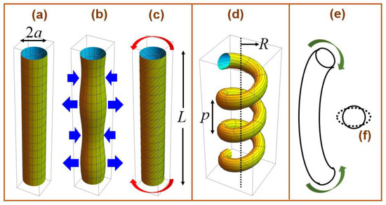 Schematic illustration of cylinder-like hollow structures. (a) A hollow cylinder. (b) A breathing mode of a hollow cylinder. (c) A twisted hollow cylinder. (d) The helix on (c) is a special case of the helical coil on (d), for which R = 0. (b) Bending of a cylinder. (e) An ovalization indicating an elliptical cross-section deformed from a circular one. (f) A circular cross section becoming an ellipse in response to an applied torque couple on (e).