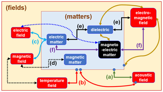 A magnetoelectric matter contains simultaneous features both of electric matter and magnetic matter. Sharp delineations of fields and matters presented in Figure 2 are made just for convenience since they may cause controversy from rigorous viewpoints. In the forthcoming sections, we will specialize those materials further into metals, semiconductors, dielectrics, magnetic materials [13,14], polymers [15], liquid crystals [5,16], etc.