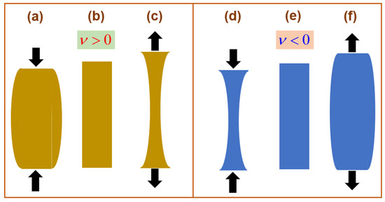 Both Figure 3a–c are obtained for positive Poisson ratios, viz., . Consider Figure 3a first. Under compression in the axial longitudinal direction, the lateral diameter is enlarged in compensation for the axial shortening. Consider Figure 3c second. Under decompression in the axial longitudinal direction, the lateral diameter is shortened in compensation for the axial elongation (or prolongation) [7,65]. As depicted in Figure 3d–f, opposite changes in the length and diameter take place for the Poisson ratio being negative, viz., .