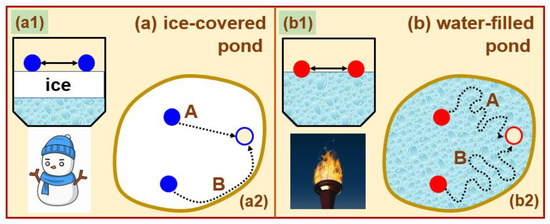 Figure 4 illustrates the interactions between electrons and phonons at two distinct temperatures. Figure 4(a1,b1) illustrate side views of a pan, whereas Figure 4(a2,b2) show top views of a pan of (intentionally) non-circular cross-section. The colored disks in Figure 4(a1,a2,b1,b2) over the surface of the respective pans emulate electrons. In comparison, the ice-covered waters in Figure 4(a1,a2) and the water masses in Figure 4(b1,b2) emulate phonons, respectively.