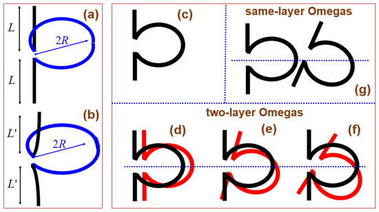 (a) A three-dimensional twisted Omega particle. Two straight-wire portions are of finite length L and of radius a, whereas the looped portion is of radius R. The plane of the looped portion is perpendicular to the straight-wire portions. See Figure 2 of [35] for more illustrative schematics. (b) An exaggerated view of a twisted Omega particle after a thermal expansion, whereby the radius of the looped portion is made larger than that shown in (a). (c) A single untwisted Omega particle. (d–f) Two-layer untwisted Omega particles, where the plane of the red untwisted Omega lies below the plane of the black untwisted Omega particle. The horizontal dotted line piercing through (d–f) is a line of symmetry as a guide to the eyes. (g) A pair of same-layer untwisted Omega particles.