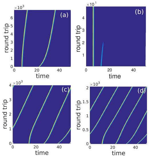 - Kutz, J.N.; Collings, B.; Bergman, K.; Knox, W. Stabilized pulse spacing in soliton lasers due to gain depletion and recovery. IEEE J. Quantum Electron. 1998, 34, 1749–1757. [Google Scholar] [CrossRef]