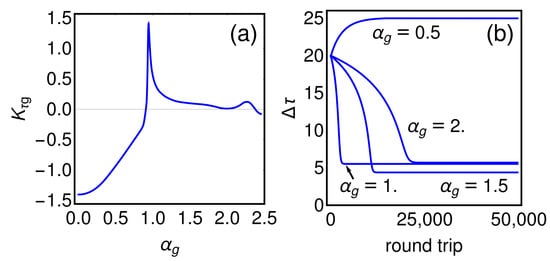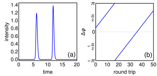 - Vladimirov, A.G.; Kovalev, A.V.; Viktorov, E.A.; Rebrova, N.; Huyet, G. Dynamics of a class-A nonlinear mirror mode-locked laser. Phys. Rev. E 2019, 100, 012216. [Google Scholar] [CrossRef] [PubMed]