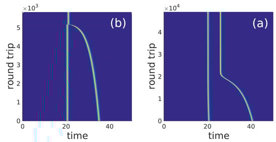 - Vladimirov, A.G. Short-and long-range temporal cavity soliton interaction in delay models of mode-locked lasers. Phys. Rev. E 2022, 105, 044207. [Google Scholar] [CrossRef]