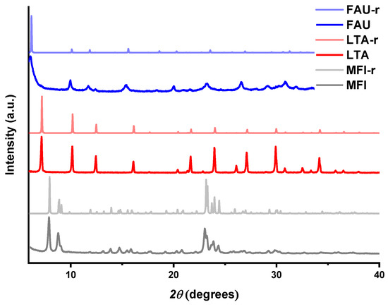 In order to study the crystalline characteristics of samples, all powders were studied using X-ray diffraction (XRD) by using Aeris Panalytical (Malvern, UK) equipment with Cu K alpha monochromatic radiation (l = 0.154056 nm, 40 kV, 15 mA). The results are presented in Figure 3. Theoretical diffractograms were retrieved from IZA (International Zeolite Association) [11], and they are identified with -r (FAU-r, LTA-r, MFI-r) as reference. For comparison purposes, the intensity of all diffractograms was normalized. When the experimental and theoretical data are compared, it can be noted in each case how the position of theoretical peaks coincides with those of peaks from experimental data.