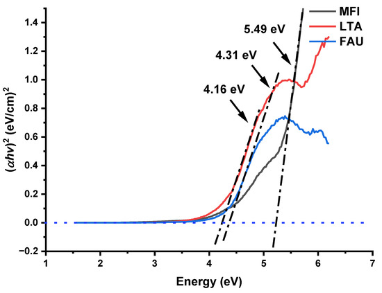 As stated before, from the UV-Vis absorption spectra, a plethora of parameters can be obtained. In the case of the band-gap, after the use of Equation (7) and considering for direct allowed transitions (direct band-gap), the Tauc plot for each zeolite was obtained (Figure 5). As is observed, zeolites FAU and LTA have a close band gap among them, but the MFI zeolite exhibits the widest forbidden band energy. This can be attributed to the chemical composition of zeolites. This includes the location of Al, Na atoms in the zeolitic matrix [17,18,19], as well as the inclusion of novel chemical species into the crystalline array [14,20].