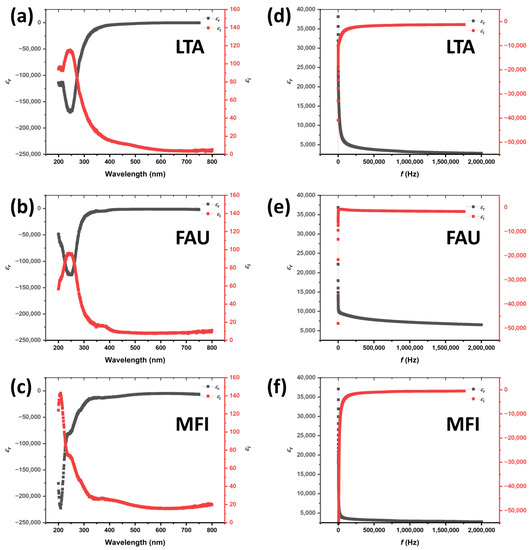 Optical complex relative permittivity, real (gray) and imaginary (red) parts, calculated for each zeolite: LTA (a), FAU (b), MFI (c); electrical complex relative permittivity, real (gray) and imaginary (red) parts, calculated for each zeolite: LTA (d), FAU (e), MFI (f).