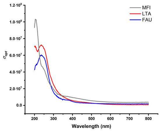 In the case of the optical conductivity, it can be calculated after Equation (6). This leads to a plot (Figure 7) similar to Figure 4a, but in this case, we have the magnitude corresponding to the conductivity in S/m. Since the optical conductivity shows the relationship between the magnitude of the induced electric field for arbitrary frequencies and the induced current density in the material, it is clear from Figure 4 that the MFI zeolite has the greatest optical conductivity at the highest frequencies or wavelengths. In contrast, between 200 and 300 nm, the LTA zeolite is the best conductor.