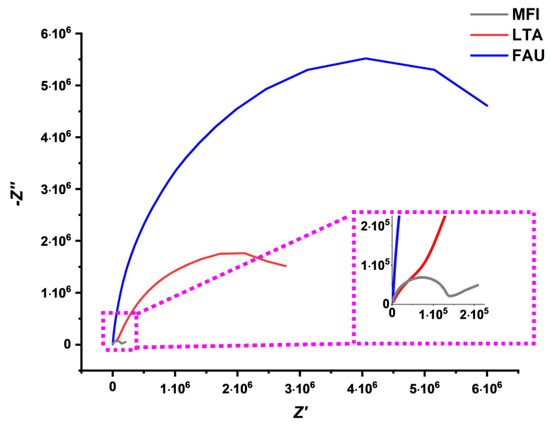 Nyquist plot for LTA, FAU and MFI zeolites.