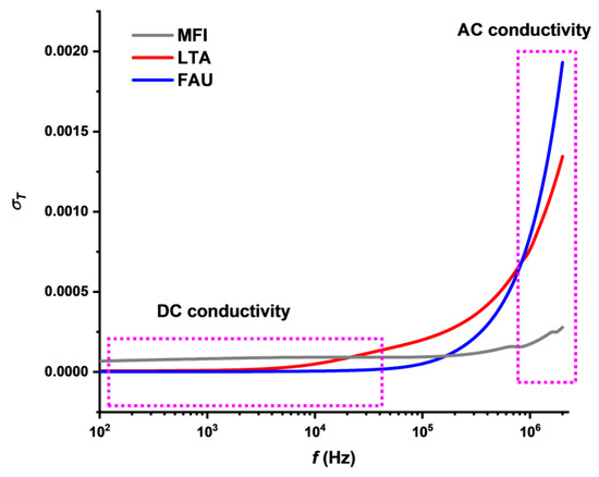 The total conductivity for all samples is presented in Figure 10. Three characteristic zones are found. The first one corresponds to DC conductivity, the second one is the transition from DC to AC conductivity, and finally the third zone corresponds to AC conductivity.