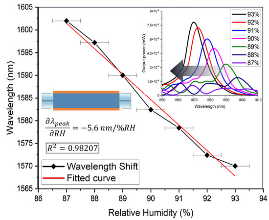 For the non-tapered structure, there was little to no change in the recorded trans-mission spectrum in the range from 40%RH to 86%RH. Once the RH in the enclosure reached 87%, a noticeable shift in peak wavelength to the left was recorded, going from 1603 nm at 87%RH to 1570 nm at 93%RH. The spectra shown in Figure 3 were recorded at integer values of %RH. As mentioned, there is a significant blue-shift behavior as the humidity increases. The optical power increase is seen as %RH increased, but this behavior is due solely to the shape of the used light source, as seen in Figure 2. As the peak wavelength shifts closer to 1550 nm, it increases in optical power. The plot of peak wavelength concerning %RH is also shown in Figure 3, revealing a highly linear dependence with a sensitivity of 5.6nm/%RH, as indicated.