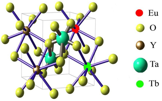 Crystal structure of M′-YTaO4 doped with Eu3+ activation (red), or Tb3+ activation (green), or double activation by Eu3+ and Tb3+ [19]. (Reprinted with permission from [20]. Copyright 1995: Elsevier).