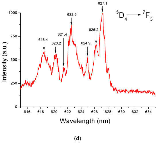 The most intensive part of the spectrum is represented by the series of lines related to the transitions 5D4→7F5 for which |Δ J| = 1 that means that they belong to the allowed transitions in a free ion. The fine structure in each part is caused by the crystal field splitting with possible participation of the vibronic sidebands. Fragments of the energy transitions 5D4→7FJ (J = 6, 5, 4, 3) and the pattern optical lines are given in Figure 4a–d. The remaining allowed transitions J = 2, 1, 0 which appear under 325 nm excitation proved to be very weak and for this reason were not taken into consideration.