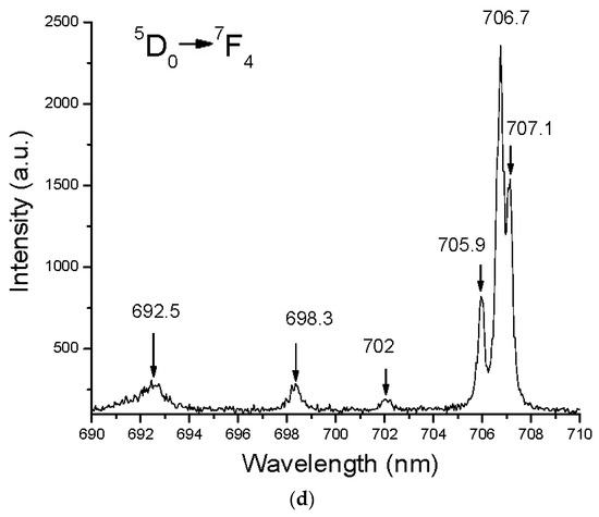 The main transitions 5D0→7FJ (J = 1,2, 3, 4) and the pattern of optical lines are given in Figure 5a–d. The remaining transitions J = 5, 6, which appear under 325 nm excitation proved to be very weak and for this reason were not taken into consideration.