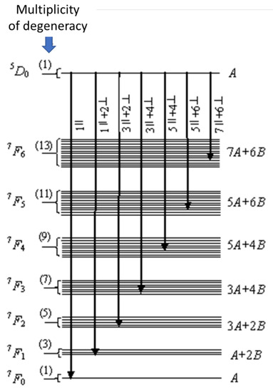 To solve this problem of the energy pattern, it is also required to get some additional data such as the relative intensities. In particular, some lines are allowed according to the symmetry rules, but their intensities could be small. Some useful conclusions can be deduced under the realistic assumption that only the low-lying crystal field sublevel originated from the 5D4 term is populated. At very low temperatures, this can be either an A or B level. For instance, if the ground sublevel is A, we have only the line corresponding to the transition A↔A (that has polarization) in the spectral region corresponding to 5D4→7F0 lines. A similar scheme of the levels for the Eu3+ ion (4f6) is illustrated in Figure 7.