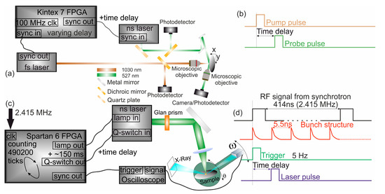 In optical pump–probe diagnostics, information regarding structural changes has only been indirectly inferred from the secondary effects exerted on optical properties. Therefore, it is necessary to integrate these methods with X-ray time-resolved techniques to obtain comprehensive information about the dynamics of the medium [10,11]. The development of ultrashort X-ray pulses holds great significance as it enables physical experiments that combine femtosecond time resolution with atomic-scale spatial resolution [12,13]. To achieve temporal resolution, it is necessary to synchronize two different sources of laser and/or X-ray radiation [14]. The difficulty of the synchronization procedure strongly depends on the type of the X-ray source. Such sources as X-ray Free Electron Laser are almost naturally synchronized with other lasers with picosecond and sub-picosecond temporal resolutions [12]. However, the maximum achieved time delays are mostly limited by several nanoseconds [15,16]. By synchronizing these sources, researchers can conduct sophisticated time-resolved experiments that capture the dynamics of ultrafast processes on natural atomic and temporal scales. The second commonly applied method of X-ray generation is laser-plasma sources [17,18]. Using high-intensity femtosecond lasers, it becomes possible to generate high-brightness X-ray radiation, which can be used for time-resolved measurements in the pump–probe approach [19]. The time resolution in such a setup is achieved by mechanically moving the delay line [17]. The time resolution is usually about sub-ps, and the maximal obtained information is limited by several nanoseconds. Finally, one of the most important sources is the synchrotron; however, its synchronization with laser sources is highly complex. The synchronization in this case is commonly achieved by phase-locked loop (PLL) systems, which give the opportunity to investigate the dynamics only up to several nanoseconds with a time resolution of tens of picoseconds [20]. To extend the time delays further, up to the microsecond region, the incorporation of electronic time delays becomes necessary.