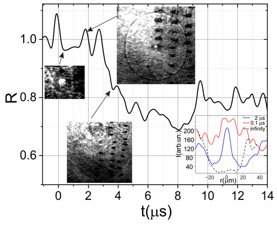 The optical diagnostics could reveal the first stages of the laser ablation of Si. The magnified image of the surface reveals distinct phenomena occurring after laser impact in a timescale of approximately 100 ns. The combination of time-resolved microscopy and time-resolved reflectance provides an opportunity to reveal the evolution of the laser’s impact on the material. Prior to the formation of a micromodification, a darkened region emerges, leading to a rapid decrease in reflection. This is indicated by the inset in Figure 2. Subsequently, a shock wave is generated, accompanied by the formation of a micromodification. Initially, the size of the micromodification is larger than its residual size, but the reflection coefficient is higher, as shown by the modification profiles in the inset of Figure 2. The size of the residual micromodification stabilizes at around 1 μs, as evidenced by the transverse profile of the resulting micromodification. Plasma luminescence in the center of the profile appears as a bright dot. Increasing the delay between the pump and probe pulses leads to a decrease in the albedo of the affected area until it reaches saturation. Additionally, the region where the albedo change is observed decreases for longer time delays (see Figure 2). Laser ablation induces high pressures and temperatures, resulting in the generation of a shock wave [26]. The laser-induced shock wave propagates from the impact area at a velocity of approximately 15 km/s, leaving the spatial overlap region between the laser and X-ray beams in approximately 4 μs. Notably, behind the shock wave front, the presence of dark regions, indicating a change in albedo, is observed. The change in the albedo could serve as an indicator of phase transitions.