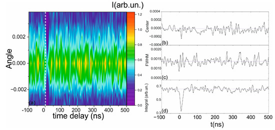 Compared to optical pump–probe diagnostics, X-ray time-resolved diagnostics of lattice dynamics induced by laser pulses are more intricate. One of the key challenges is the requirement to measure the X-ray rocking curve for all time delays. This entails obtaining time-resolved dynamics for at least five different diffraction angles. The resulting dynamics can be visualized as a “heat map”, with the diffraction angle and time delay as axes (see Figure 3a). This visualization helps to capture the complex temporal evolution of lattice dynamics induced by the laser pulses. The analysis of such heat maps provides valuable insights into the structural and dynamical changes occurring in the material on ultrafast timescales.