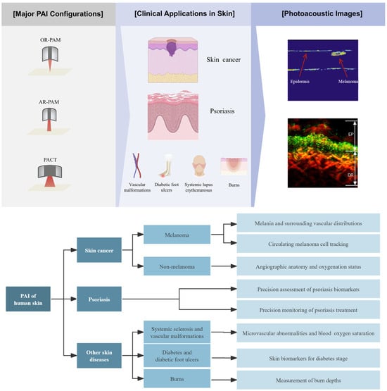 In this review, our objective is to narrow down the focus to the application of PAI in dermatology, a domain that has often been approached with a broader scope in previous literature [,,,,,,]. Unlike previous reviews that predominantly focused on either photoacoustic microscopy (PAM) or photoacoustic computed tomography (PACT) [,,,], our review encompasses both modalities, offering a comprehensive overview of PAI applications in dermatology. By consolidating information on major PAI configurations and highlighting multiple clinical translation potentials, we aim to emphasize the unique role of PAI in addressing critical challenges in the diagnosis and treatment of skin cancer, psoriasis, and other dermatological conditions (Figure 1). This targeted approach allows for a deeper exploration of PAI’s potential contributions to dermatology, enhancing the understanding of its clinical relevance and utility.