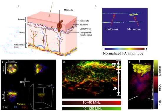 (a) Layers of human skin. (b) Melanoma image acquired with PACT, clearly showing the melanoma and skin surface []. (c) In vivo Volumetric Multispectral optoacoustic tomography (vMSOT) images in different orthogonal views and 3D map of skin tumor showing melanin, Hb (blue) and HbO2 (red) signals. Clusters of melanin signals were observed with strong hemoglobin signals underneath the tumor, indicating the extent of tumor’s vascularity. Measurements of tumor dimensions were acquired from the xy and xz planes to obtain the maximum length, width and depth (including vasculature) parameters []. (d) Maximum intensity projection (MIP) cross-sectional images of a melanoma lesion edge (red: larger structures in the bandwidth of 10–40 MHz; green: smaller structures in the bandwidth of 40–120 MHz) []. (e) 3D MSOT rendering of a representative BCC lesion showing melanin (yellow), Hb (blue) and HbO2 (red) signals. Melanin signals were clustered at the top with strong hemoglobin signals underneath the BCC, showing deeper vasculature structures and the lesion [].