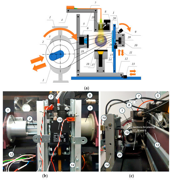 (a) Schematics of the setup, 1—holders, 2—reference preform, 3—test sample, 4—pump diode, 5—V-shaped groove, 6, 16—aluminum boxes, 7—fiber optic patch cord, 8—reference photodetector, 9, 11, 13, 15—stepper motors, 10—femtowatt infrared photodetector, 12—movable aluminum rail, 14—vertical minirails, 17—white LED, 18—diaphragm, 19—splitter–scatterer, 20—optical filter; (b) photo of the across-the-rail measuring cell; (c) photo of the along-the-rail measuring cell.