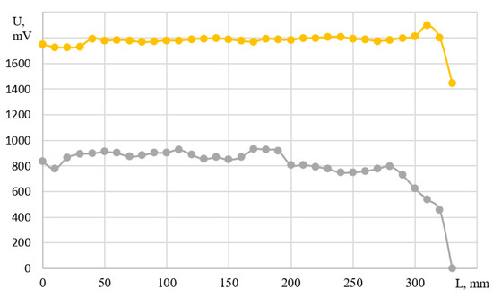 Photodetector output voltages in measuring (yellow) and reference (gray) channels along the length of the preform under testing. The preform length is 330 mm.