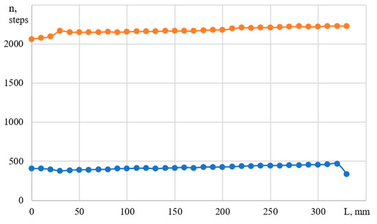 Coordinates of the active element luminescence center (in motor steps) along the abscissa (orange) and ordinate (blue) axes along the length of the sample under testing. The preform length is 330 mm.