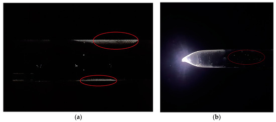 It was previously found that sample side illumination is one of the most effective. Firstly, this brings the problem closer to the already solved one: television measurement of the preform diameter during the chemical vapor deposition process, where the sample is illuminated by the flame of an oxygen–hydrogen torch. Secondly, experiments have shown that face illumination, although possible, is more suitable for the glass surface defects visualization. Thus, Figure 4 shows a system design variant, where the LED radiation is injected into the technical holder and subsequently propagates along the sample to its opposite end.