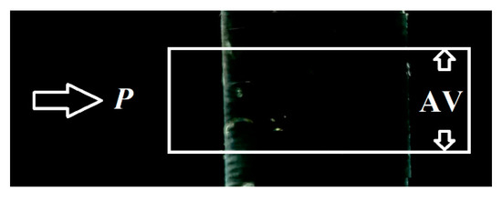 Preform side illumination. The letters “AV” indicate the direction of averaging, P is the direction of light propagation, white rectangle designates the area of data acquisition.