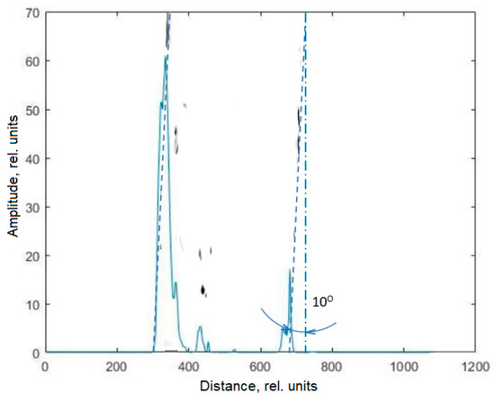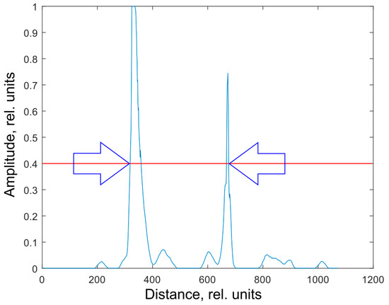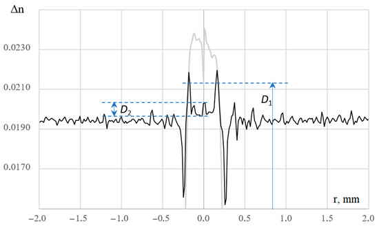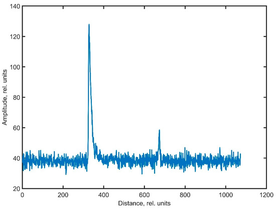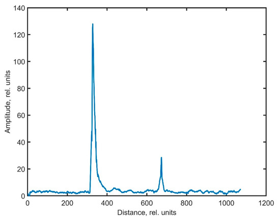 Figure 6 shows that the intensities of the two peaks corresponding to the preform outer layer boundaries are not the same. This is due to the fact that illumination occurs only on one side of the preform under test; therefore, the opposite side of the outer surface is illuminated less intensely. In this regard, with large diameters of the preform, as well as with intense noise during image digitization, mixing of the useful signal (second peak) with noise may take place. There are several ways to get rid of the noise component: