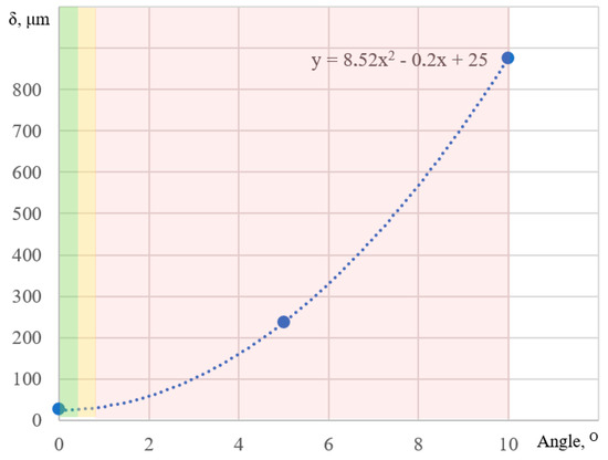 The preform boundary detection accuracy depending on the angle of its inclination in the area under testing. The colors indicate the probability of such a defect occurring (green—high; yellow—medium; red—low).
