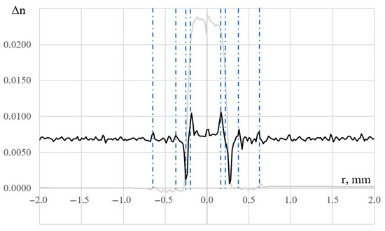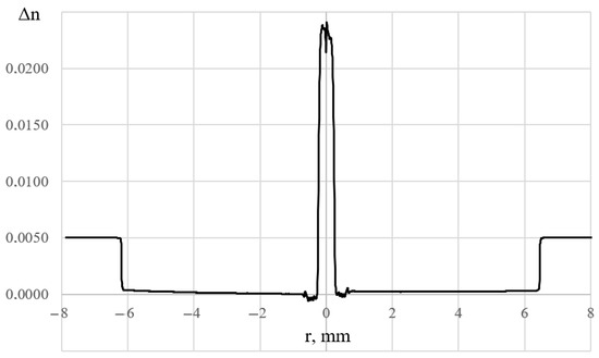 The distribution of optical–geometric characteristics along the length of the optical fiber is determined by the stability of the refractive-index–preform radius function in each position and projection. To save time in the overall process, detailed examination of the refractive index profile can be carried out using special equipment in one position of the preform. Figure 12, for example, illustrates the refractive index profile of a silicon oxide, germanium oxide, aluminum oxide, and erbium oxide doped preform, obtained using a commercial testing setup PK2600 (Photon Kinetics, Beaverton, OR, USA).