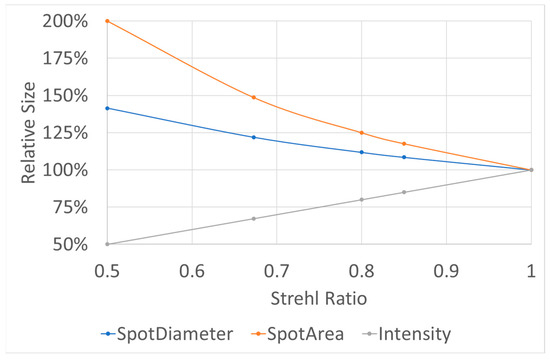 2 < 1.25 (~1.15); SR > 0.8 (~0.85). As shown in the results, this means a spot size +16% larger than ideal, a spot area +35% larger than ideal, and an intensity in the focus only 74% from ideal.