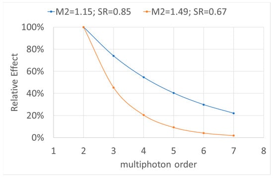 2 ~1.15 and SR ~0.85), the actual effect would be 74% of the diffraction-limited effect for a three-photon process; but further reduce to 55%, 40%, and 30% of the diffraction-limited effect for four-photon, five-photon, and six-photon processes, respectively.