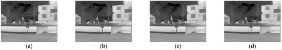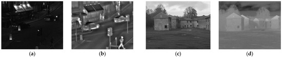 The image pairs that we tested for our experiments were downloaded from the website, https://doi.org/10.6084/m9.figshare.c.3860689.v1 (accessed on 26 January 2024), they can also be found in Ref. [27]. These two pairs of source images are shown in Figure 5. (a) and (b) are VI and IR images (434 × 340), mainly including road, cars, and people. (c) and (d) are VI and IR images (640 × 480), mainly including trees, buildings, and a person.