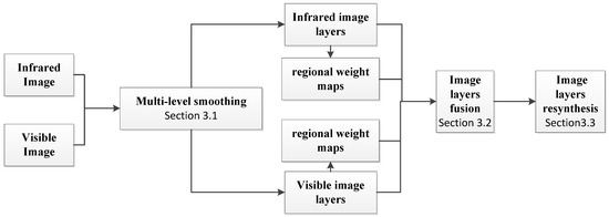 As shown in Figure 4, we have described the flowchart of the implementation of the proposed method. Firstly, the IR image and the VI image are processed into image layers (Section 3.1). Secondly, image fusion is achieved using regional weight extraction based on image layers (Section 3.2). Finally, we try to resynthesize these fused layers to form a fused image (Section 3.3).