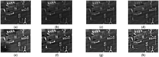The fusion results for Figure 5a,b are shown in Figure 6. The two images contain unique information, especially the road, cars, and people. Figure 6a–h are the fused images with different methods. In these two source images, the special information includes pedestrians and cars on the road, the signs on the shops, and some streetlamp details. In image (a), the result of the WLS method looks good, but it loses some details. The results of images (b), (c), and (d) have low contrast, and those details are not clear enough. The results of (e), (f), and (g) look better than (b), (c), and (d), they have a good visual effect, and the main features are well preserved and highlighted. According to (h), our algorithm inherits much information with good image contrast. Meanwhile, compared with (e), (f), and (g), the result of the proposed method emphasizes those small features much better.