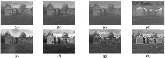 Figure 7 shows the fused results for Figure 5c,d using the eight approaches. The main information in these two images is trees, buildings, and a person, especially the running person. In the VI image, this person can be hardly seen, while in the IR image, they can be well observed; whether the person could be found in the fused result would greatly affect the subjective evaluation. From images (a), (b), (c), and (e), we cannot easily find this person, so WLS, BF, SVD, and MST fail to inherit and preserve this important detail feature. The result of FG for the image (d) seems to be low contrast, and the details on the grass are completely lost. In image (g), the MBSE creates a good result, but the details on the grass are completely lost. CSTH produces a better result, as the main features are well preserved and highlighted. According to (h), our algorithm has the best visual effect with good contrast, and those small details are preserved and highlighted, too.