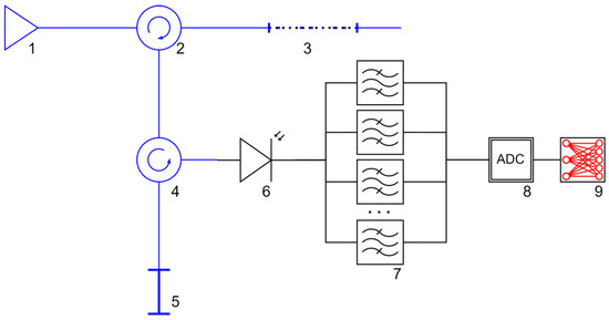 Scheme of microwave photonic interrogation of the FPI temperature sensor: 1—wideband optical source; 2 and 4—optical circulators; 3—superstructured FBG; 5—FPI sensor; 6—photodetector; 7—bandpass filters of the beating signal; 8—analog-to-digital converter; 9—ANN-based data processing unit; blue lines designate optical connections, black lines—electrical connections.