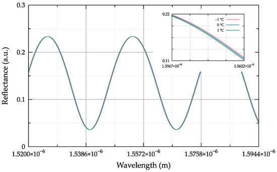 The modelling result of the Fabry–Perot interferometer reflection spectrum obtained at ±1 °C temperature change is shown in Figure 2 (data obtained at ε1 = 2.1556, μ1 = 1.0, ε20 = 4.2025, μ2 = 1.0, ε3 = 1.0, μ3 = 1.0, H0 = 21 μm, Kε2 = 15 × 10−6 T−1, Kε1 = 8.6 × 10−6 T−1, α = 1 × 10−6 T−1).
