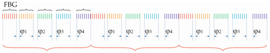 determining the phase shift between the gratings, where n is the number of partitions of the full circle [0, 2π] into sections φi. An example of a superstructure scheme consisting of three separate structures, each formed from five homogeneous fiber Bragg gratings, is shown in Figure 3. The red curly braces in the figure denote the structures, and the black curly braces denote the homogeneous Bragg fiber gratings; φi denotes the phase shifts configured by (8).
