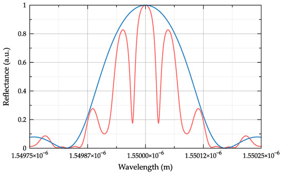 Reflection spectrum of the superstructured FBG array with n = 4 (red line) and its envelope (blue line). The total length of the structure is 25 mm, and the length of the homogeneous segment is 5 mm.