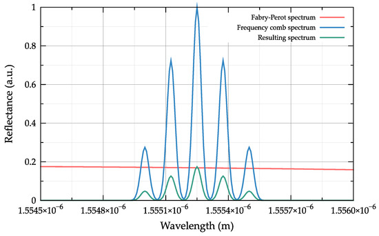The interaction spectrum of the probing radiation and the Fabry–Perot interferometer is modelled by multiplication at the same wavelengths (frequencies) of the spectra of the interferometer and the optical frequency comb, as shown in Figure 6.