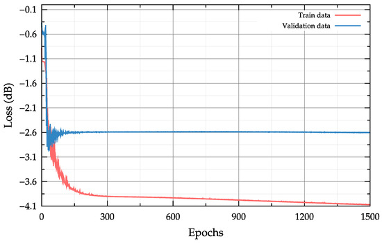 As part of the input data, as required by the training algorithms, the labelled dataset was divided into a training dataset (90%) and a control dataset (10%). The training dataset was used directly to adjust the weights, while the control dataset was used to determine the accuracy of model performance between training iterations and was not used to adjust the weights. Already after 1500 epochs of training, the value of the loss function did not exceed 0.001, as shown in Figure 9.