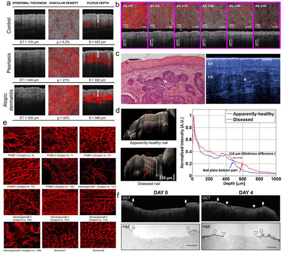 Examples of applications of OCT and OCTA imaging. (a) Some characteristics quantifiable by OCT include epidermal thickness, vascularity, and plexus depth. Image reproduced with permission from [62]. (b) Monitoring efficacy of biologic therapy in patient with atopic dermatitis (t = weeks). Image reproduced with permission from [62]. (c) Basal cell carcinomas identified by histopathology (left) or non-invasive OCT (right) showing multiple tumor lobules. Image reproduced with permission from [57]. (d) Cross-sectional images of healthy and diseased toenail, detecting differences in nail thickness. Image reproduced with permission from [58]. (e) En face images showing cutaneous vasculature of port-wine birthmarks (PWBs) and hemangiomas compared with normal skin. Image reproduced with permission from [100]. (f) Quantifying changes in wound healing by OCT and histopathology. Arrows indicate the initial wound edge, arrowheads indicate edge of migrating epithelial tongue. Image reproduced with permission from [101].