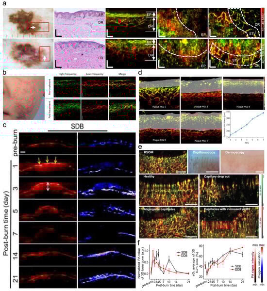 In Figure 2, significant applications of PAI for skin imaging are demonstrated. He et al. compare dermatoscopic, histopathologic, and PAI imaging (cross-sectional maximum intensity projection (MIP) image of the epidermis and dermis and en face MIPs from the epidermis and dermis layers) of a dysplastic nevus (top) and melanoma (bottom), as shown in Figure 2a. Note the significant difference in the dermal layer of the density of surrounding tissue vessels, which is evident in both the cross-sectional and en face images [142]. Figure 2b shows a report by many members of the same group of the effect of hemangioma treatment [165]. As with Figure 2a, the acoustic signals are divided into two frequency bands, low (red channel) and high (green channel), and beamforming is used to generate two separate images. The composite image is generated by fusing the two channels. Separation of the signal into two channels and recombination after frequency equalization enables improved rendering of fine spatial details (high frequency) and lower-resolution skin structures (low frequency). In Figure 2c, Geisler et al. demonstrate the use of PAI for wound depth assessment and the monitoring of wound healing [166]. The two channels in Figure 2c show the total PA signal intensity (scale bar, red) and oxygen saturation of tissue (scale bar, blue to red). Oxygen saturation is computed by unmixing multispectral PA images and accounting for the different contribution of saturated and unsaturated hemoglobin to the total signal. PA can not only detect psoriasis but can also be used to calculate a psoriasis area severity index (PASI). In [167], He et al. develop a deep learning-based method for automated analysis of RSOM image volumes and use it to demonstrate psoriasis severity. Again, the signal is separated into low and high frequencies. Although not particularly noticeable en face, in the cross-section, the vascular distribution in the epidermis is quite prominent compared with healthy skin. Nitkunanantharajah et al. [168] demonstrate nail imaging (Figure 2e). After first showing the significantly enhanced image quality of PAI compared with capillaroscopy and dermoscopy, they show its use in detecting the autoimmune disease systemic sclerosis, where there is a clear comparison between a healthy nail and examples of a sclerotic nail displaying capillary drop out, capillaries with increased width, and angiogenic, twisted capillaries. In addition to monitoring treatment response, PAI can also monitor skin damage over time [169].