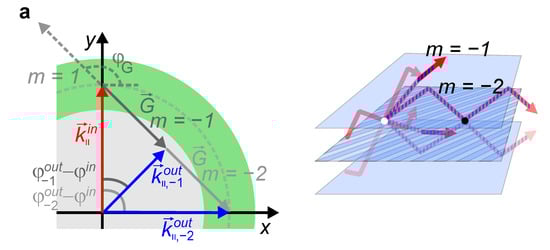 In order to achieve precise deflection, it is crucial to adjust the grating vector accordingly. We elaborate on this by presenting the momentum in more detail in Figure 2 and examine a few examples of grating structures that must be avoided for the intended application.
