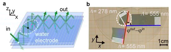 In Figure 3a, we present a sketch of the experiment. Green laser light (λ = 532 nm, θ < 1.5 mrad) was coupled into the waveguide through an optical grating (Λ = 555 nm) and propagated in the y direction. The generated beam pair traveled through the waveguide with the azimuthal angle and interacted with a deflection grating ( nm; deg), being deflected to the x-direction by an angle of 81.3 deg. Figure 3b shows a photograph of the fabricated waveguide. Through symmetric lamination, the two layers of lithium tantalate µm became orientated in the opposite direction to the c-axis. When a voltage was applied, a phase difference was induced within the beam pair. The relative phase shift caused by the electric field can be determined using Equation (4).